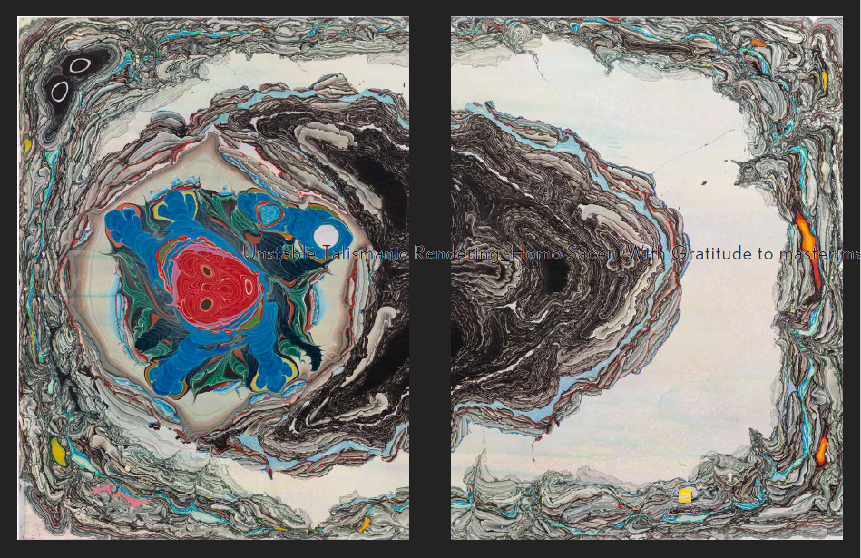 Kerstin Brätschs Künstlerbuch zeigt auf 72 Seiten die Reproduktion einer gleichnamigen Marmorierung im Maßstab 1:1. Die 274,3 x 1,82,9 cm große Papierarbeit realisierte Brätsch gemeinsam mit dem Kunsthandwerker Dirk Lange. Dafür wurde in einem aufwendigen Prozeß Farbe in ein Wasserbad getropft, die dann von einem darüber gelegten Blatt aufgesogen wurde. Das Werk, das sich durch den Detailreichtum digitaler Renderings auszeichnet und auf dem man einen Totenkopf mit geöffneter Schädeldecke erkennen kann, schillert zwischen Abstraktion und Gegenständlichkeit. Der mit einem Thermoeffekt versehene schwarze Buchumschlag zeigt das darunter liegende Motiv nur bei Berührung durch eine warme Hand.